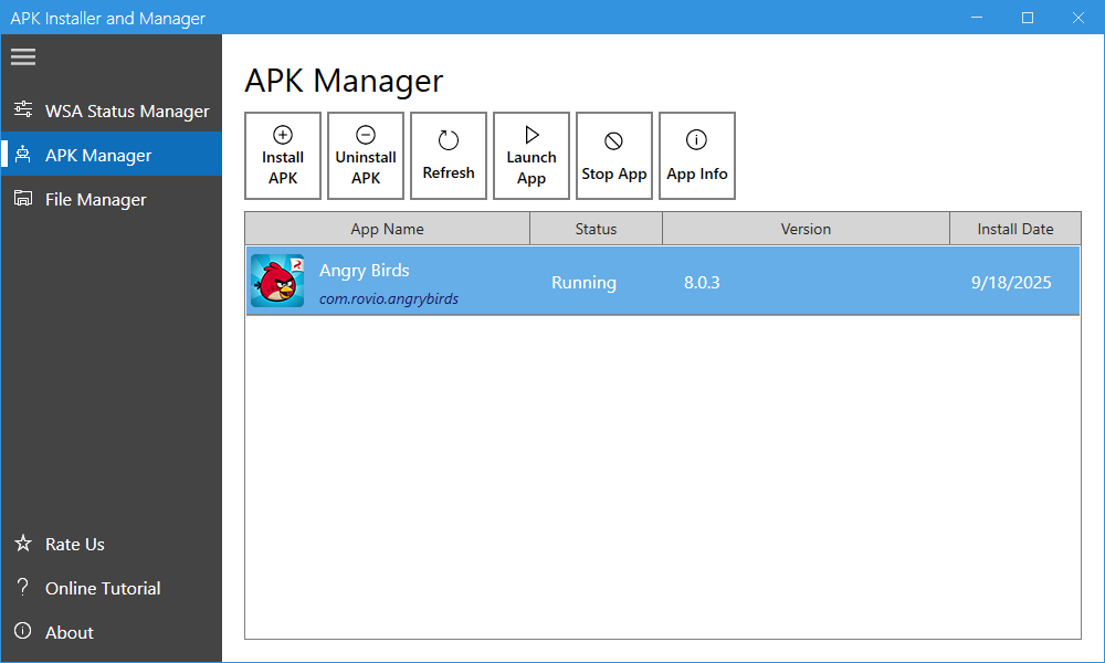 APK Installer and Manager includes an APK manager that allows you to install, uninstall, launch, and stop Android apps.