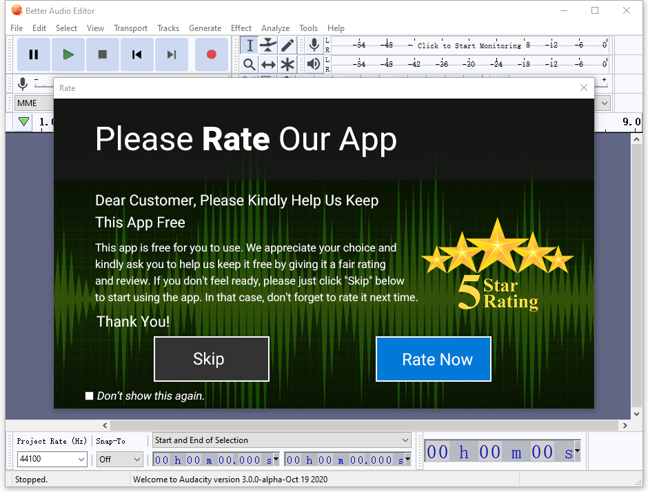 No, it’s not a have-to. The app is free for everybody to use for any purposes. Although we encourage users to give us a fair review and rating on Windows Store, you can always skip the window by clicking the “Skip” button at the left bottom corner. In addition, you can check the checkbox “Don’t show this again” if you are sure about it, as displayed below.