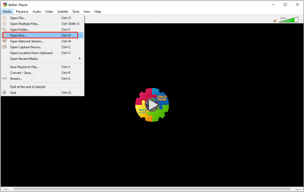 Step 3: in the “Open Media” window, select “DVD” or “Blu-ray” or other disc type that you want to play
