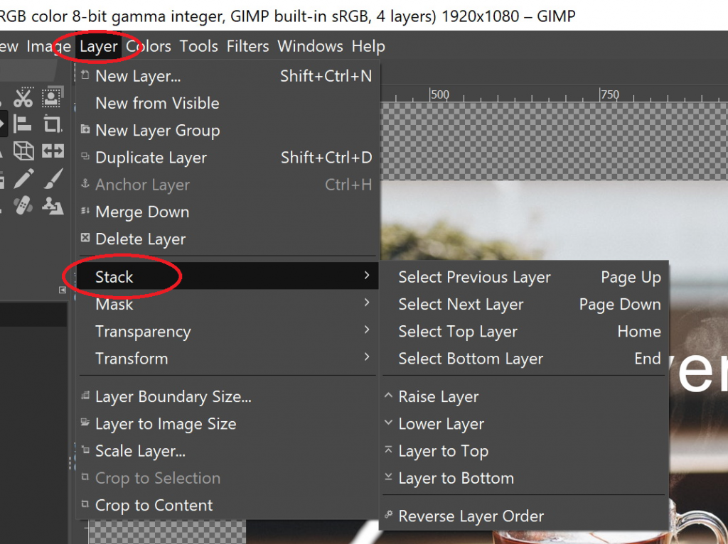 To access the “stack” option, click on “Layer” in the top menu bar and select “Stack” in the drop-down menu.
