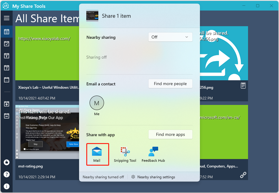 In order to share a item to another application, simply click that item. Then, in the “Share 1 item” windows, select the application, person or device that you want to share with. In this case, let’s choose “Mail”. The Mail application will automatically launch with the file as an attachment. After sending out the email, My Share Tools will automatically delete the share item that has been successfully shared out.