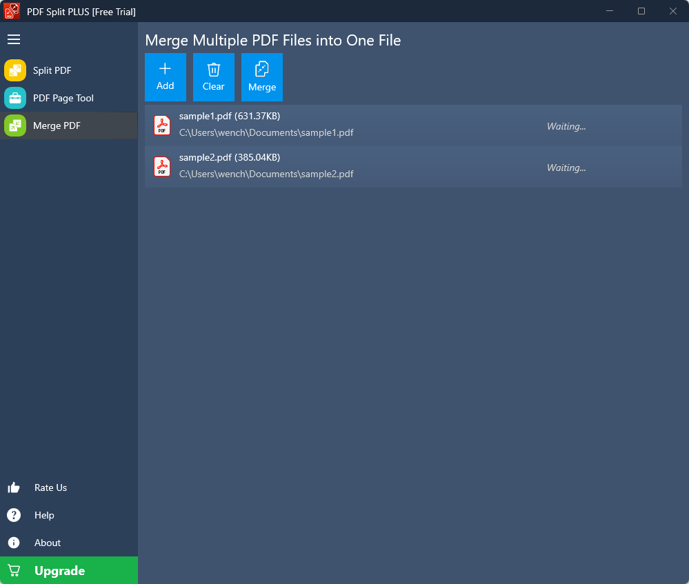 PDF Split PLUS provides three license models: a one-week free full trial version, a limited trial version and a full version. Everybody will enjoy the full features for 7 days after starting to use it. When the free full trial expires, the app becomes the limited trial, in which you can still do everything except merge PDF. Anytime you can purchase a full license (US$1.99 to 10.99) to upgrade the app to the full version.