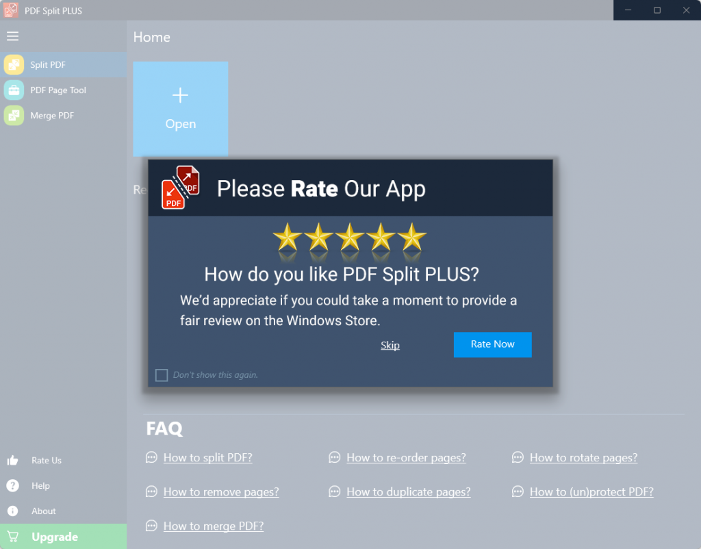 No, it’s not a have-to. The app is free for everybody to use for any purposes. Although we encourage users to give us a fair review and rating on Windows Store, you can always skip the window by clicking the “Skip” button at the left bottom corner. In addition, you can check the checkbox “Don’t show this again” if you are sure about it, as displayed below.