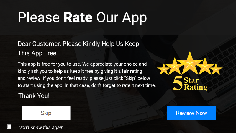 No, it’s not a have-to. The app is free for everybody to use for any purposes. Although we encourage users to give us a fair review and rating on Microsoft Store, you can always skip the window by clicking the “Skip” button at the left bottom corner. In addition, you can check the checkbox “Don’t show this again” if you are sure about it, as displayed below.