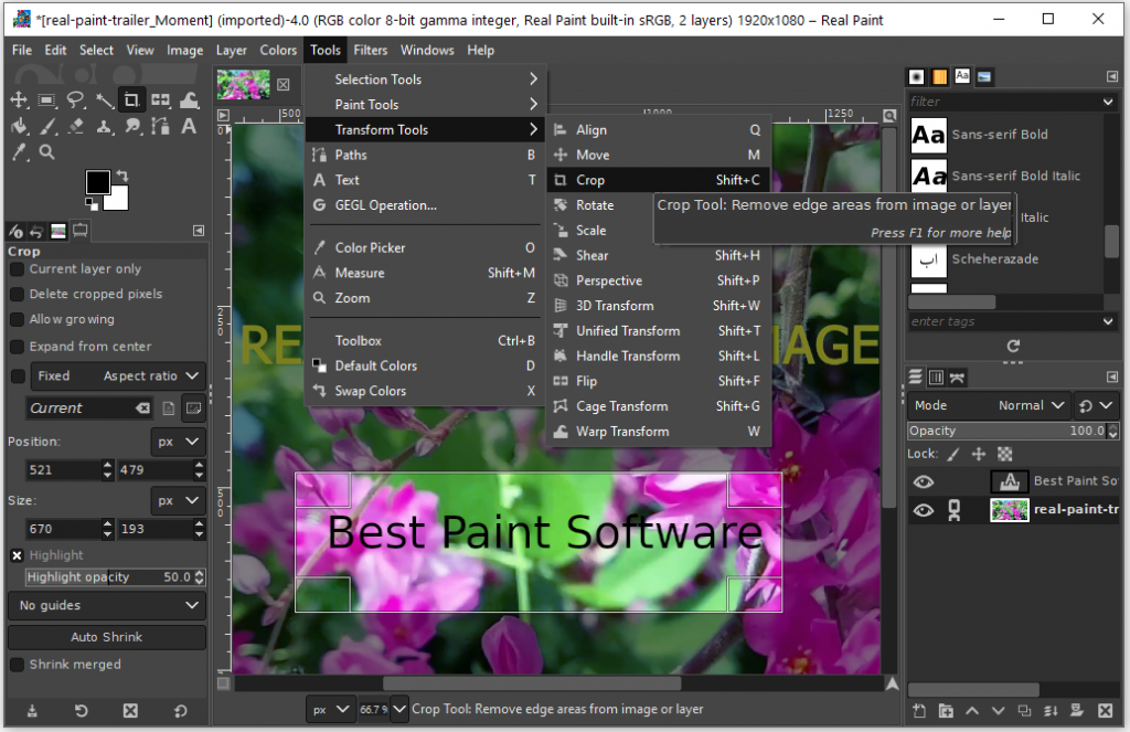 In order crop an image, you need to activate the Crop tool first. You can do so by clicking the tool directly in the tool palette, or following the menus “Tools” -> “Transform Tools” -> “Crop”. With the tool activated, you use your mouse to draw a rectangle in the open image. The region in the rectangle is the region to crop. You can also fine adjust this region by adjusting the four corner’s positions of the rectangle. Once you are satisfied with the region, press the “Enter” key on your keyboard, and the crop is done.