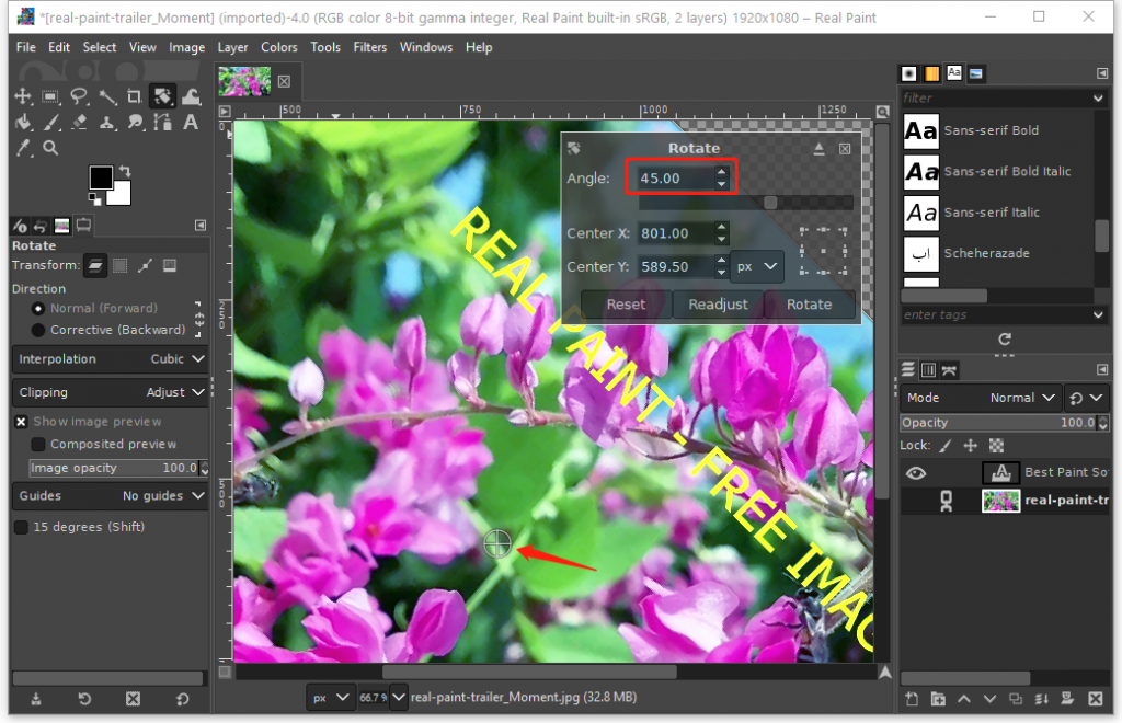 In order to rotate an image, you need to open the rotate dialog by following the menus “Tools” -> “Transform Tools” -> “Rotate”. In the dialog, input the angel, adjust the center position if required, and then click the button “Rotate”.