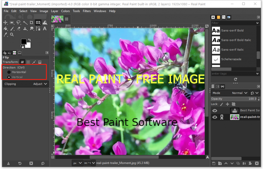 In order to flip an image, you need to open the image first. Then open the Flip tool by following the menus “Tools” -> “Transform Tools” -> “Flip”. You choose the option “Horizontal” or “Vertical” and then use your mouse to left click the open image. The image will be flipped immediately.