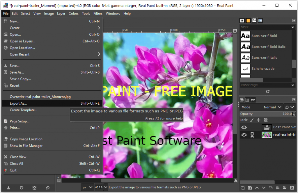 In order to export an image, follow the menus “File” -> “Export As”. In the dialog, you edit the filename and extension directly, and then click the button “Export”.