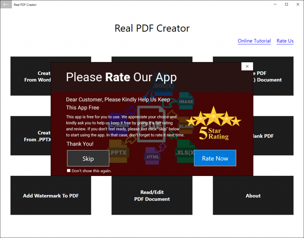 No, it’s not a have-to. The app is free for everybody to use for any purposes. Although we encourage users to give us a fair review and rating on Microsoft Store, you can always skip the window by clicking the “Skip” button at the left bottom corner. In addition, you can select the checkbox “Don’t show this again” if you are sure about it, as displayed below.
