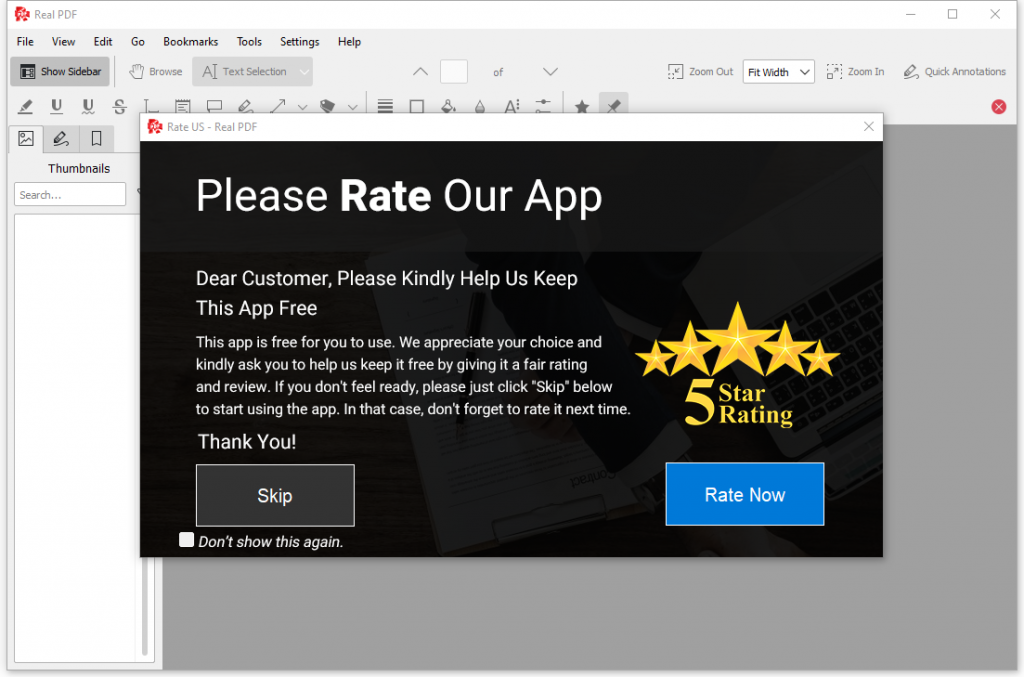 No, it’s not a have-to. The app is free for everybody to use for any purposes. Although we encourage users to give us a fair review and rating on Windows Store, you can always skip the window by clicking the “Skip” button at the left bottom corner. In addition, you can check the checkbox “Don’t show this again” if you are sure about it, as displayed below.