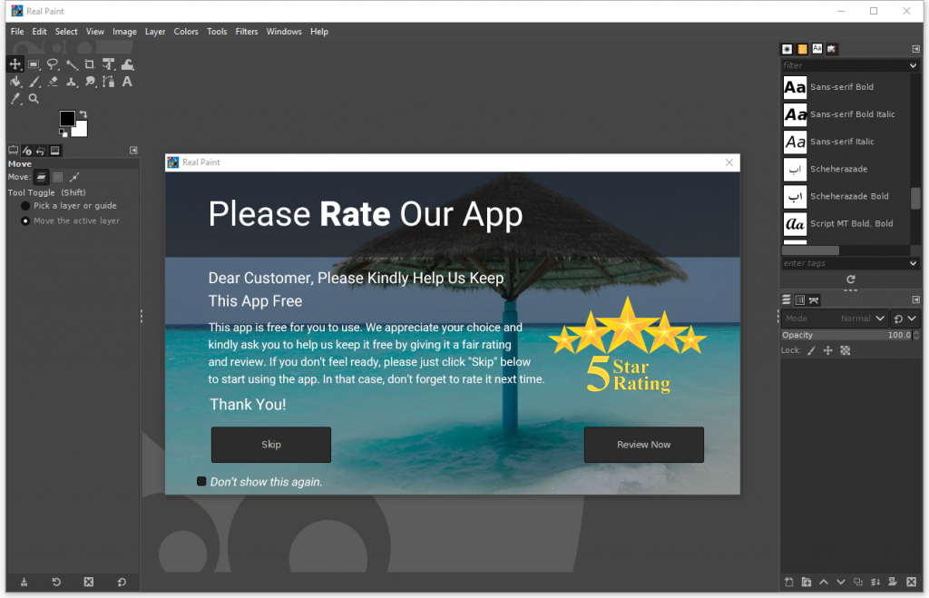No, it’s not a have-to. The app is free for everybody to use for any purposes. Although we encourage users to give us a fair review and rating on Windows Store, you can always skip the window by clicking the “Skip” button at the left bottom corner. In addition, you can check the checkbox “Don’t show this again” if you are sure about it, as displayed below.